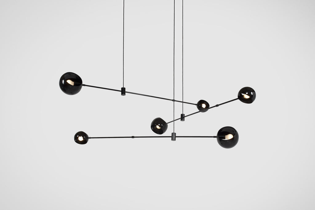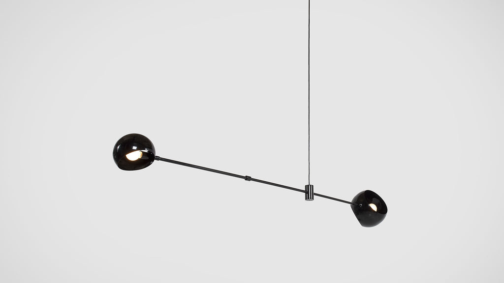 The Acaba is comprised of two different sized Boi shades mounted on opposite ends of a single, powder coated steel rod. Suspended by an off-center counterweight, each shade rotates 320 degrees with openings at the top and bottom for maximized light. This suspension fixture also works well when installed in multiples.