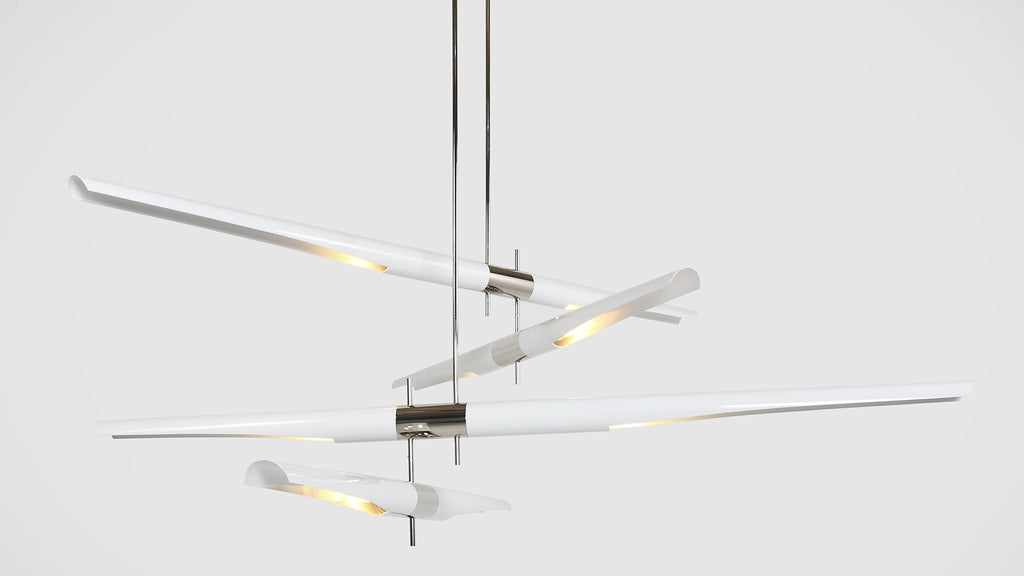 The Hennen Mobile part of Hennen collection is a suspended fixture comprised of two offset tiers suspended from a nickel-plated steel rod. Asymmetrical tiers are comprised of long and short shades that can be set to cast light up or down. Tiers scissor open when installed on site and arrangement is adjustable based on client specifications.