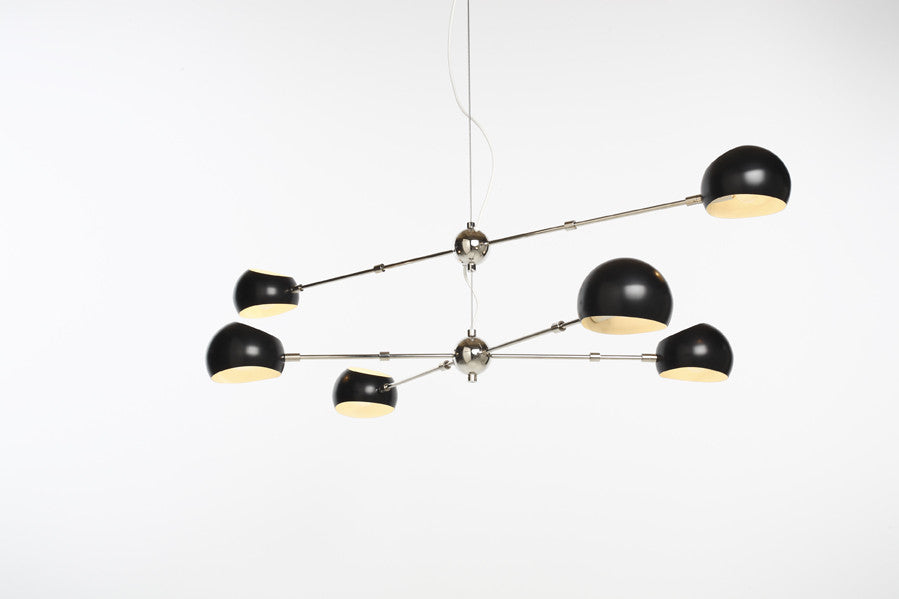The Oval Boi has a plated frame with six rotating shades on two tiers: two arms on the top tier, and four arms on the bottom tier. Shades rotate 320 degrees and tiers are available in four diameters; they can also be customized to client specifications.