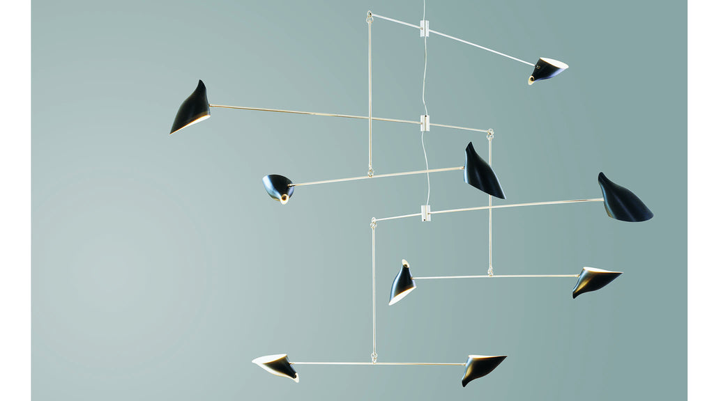 The Hanging Mobile is a balanced fixture, custom crafted to client specifications. With a minimum of two tiers, the Hanging Mobile can extend both horizontally and vertically. Each tier is comprised of three segments, balancing on an asymmetrical axis while allowing natural movement. Large bottle shades rotate 320 degrees to direct light as needed.